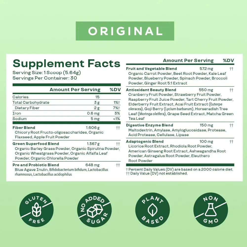 - Ingredientes: superfoods orgánicos (matcha, espinaca, kale, frutas, enzimas, probióticos, adaptógenos)