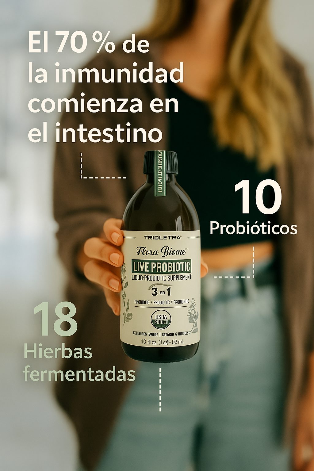Un probiótico natural que equilibra tu flora intestinal, fortalece tus defensas y te devuelve la vitalidad cada día. Triple acción 3 en 1: Prebiótico, Probiótico y Postbiótico,