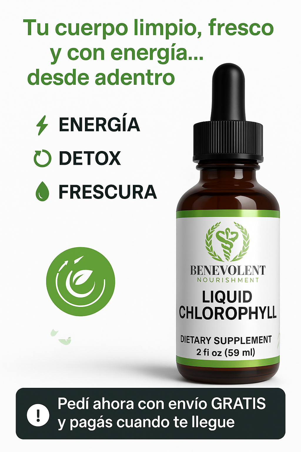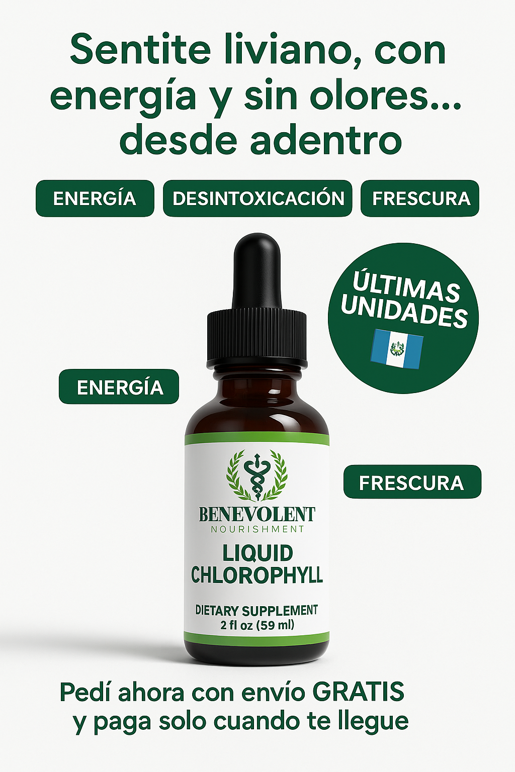 Un suplemento líquido a base de clorofila que actúa como desodorante interno, aumenta tu energía y refuerza tus defensas de forma natural.