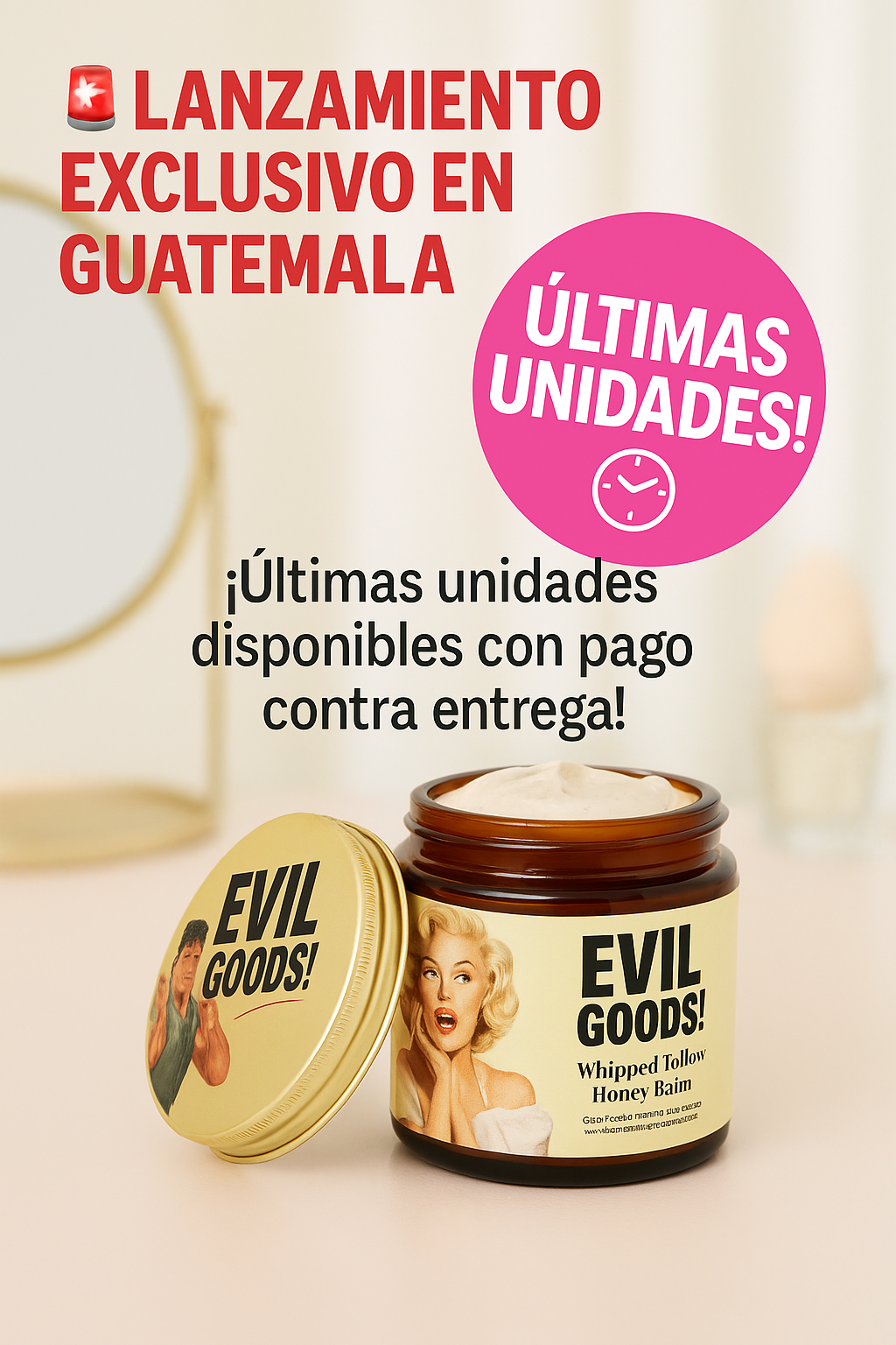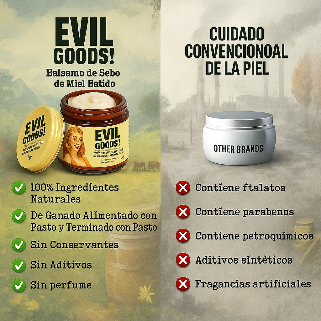 Evil Goods™ combina sebo de res purificado y miel para hidratar profundamente, mejorar la elasticidad y dejar tu piel suave y luminosa.