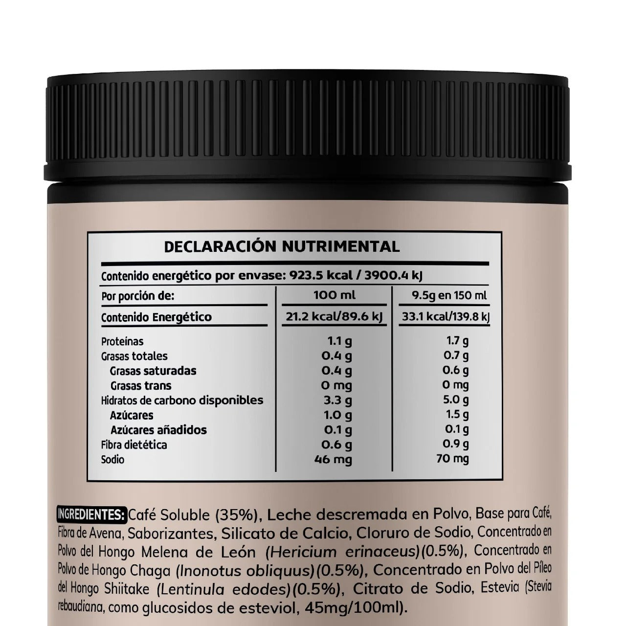 - Ingredientes: Café soluble + extractos de melena de león, chaga y shiitake