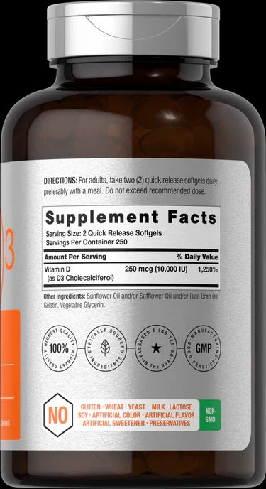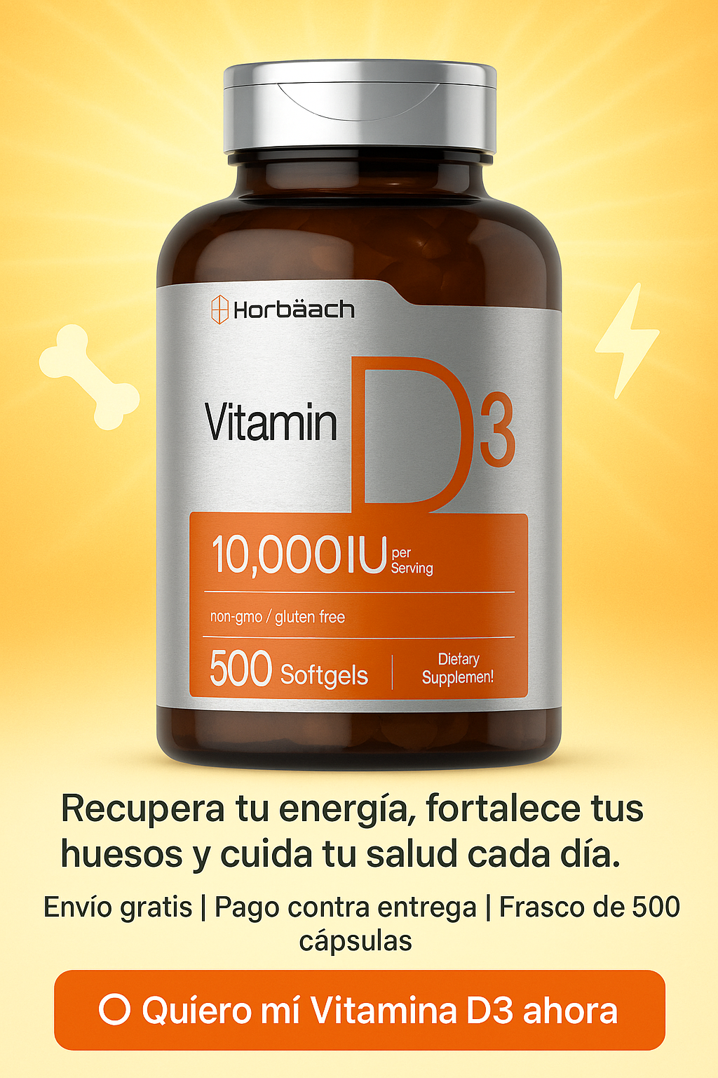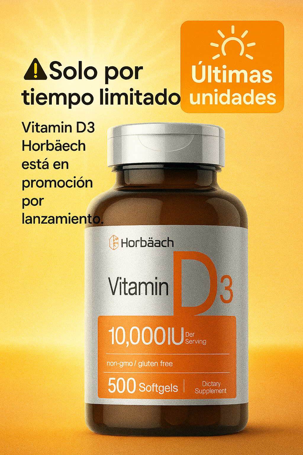 Refuerza tu sistema inmune, fortalece tus huesos y mejora tu energía diaria con Vitamin D3 Horbaach: 10,000 IU de vitamina esencial en cada cápsula.