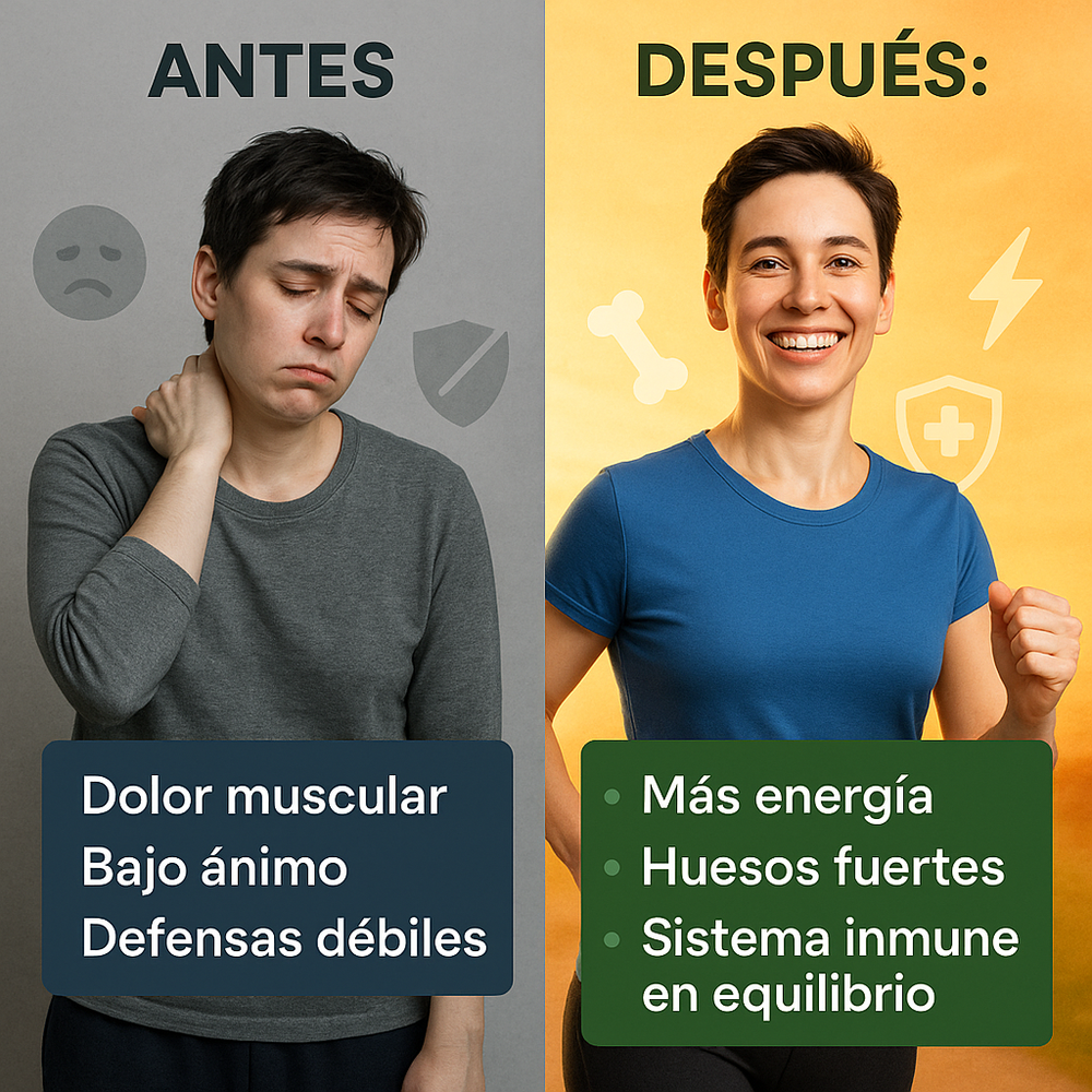 🛡 Fortalecer el sistema inmunológico🦴 Mejorar la absorción de calcio y la salud ósea💪 Apoyar músculos y energía natural🌞 Compensar la falta de exposición solar