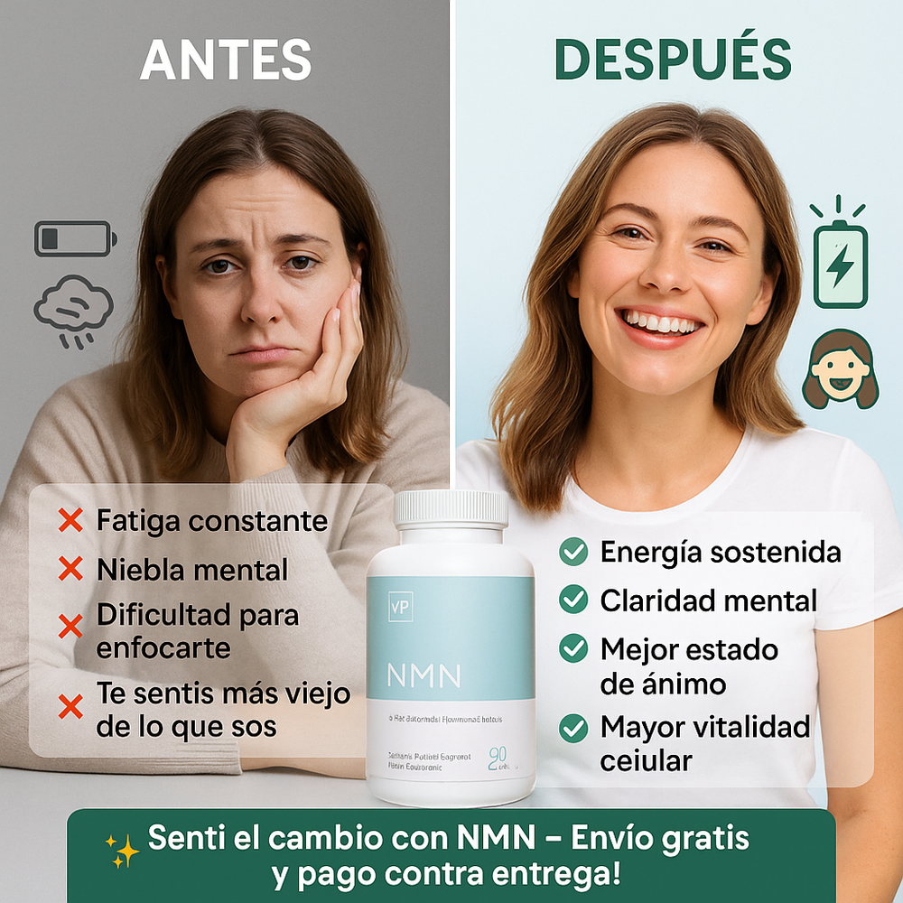 El NMN (Nicotinamide Mononucleotide) aumenta la producción de NAD⁺, una molécula clave para mantener la energía, la reparación celular y ralentizar el envejecimiento.